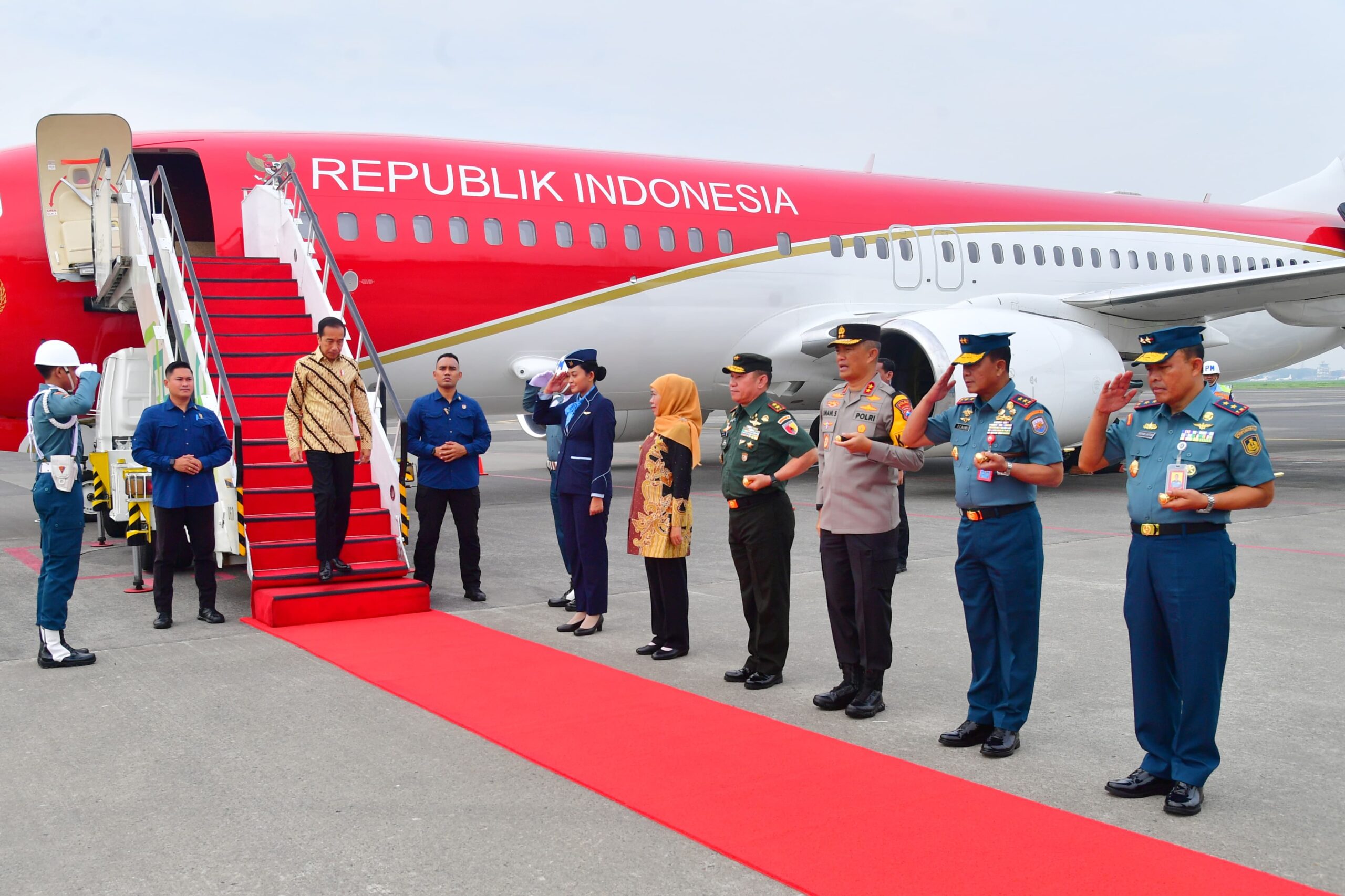 SangrajawaliNews.Com, Surabaya,- Pangdam V/Brawijaya, Mayjen TNI Rafael Granada Baay bersama Forkopimda Jatim menyambut kedatangan Presiden RI, Joko Widodo di Bandara Juanda, Surabaya. Senin (15/01/2024).