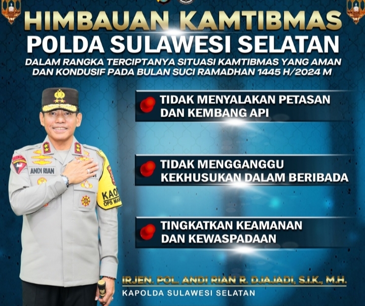 Berikut imbauan resmi dari Kapolda Sulsel tentang Kamtibmas dalam rangka terciptanya situasi yang aman dan kondusif pada bulan suci Ramadhan 1445 H/ 2024 diwilayah Sulsel.