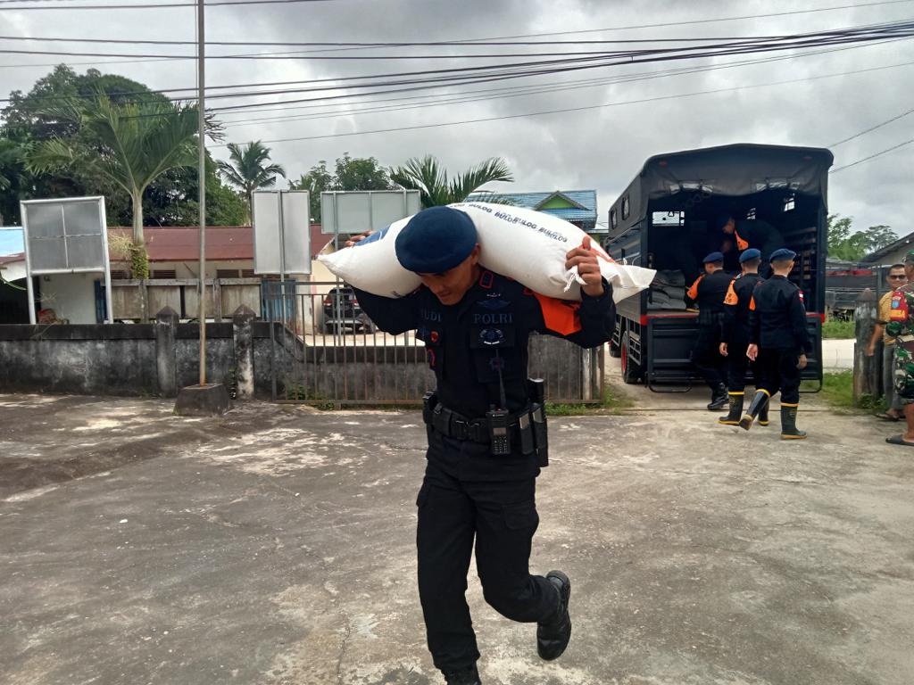 Batalyon C Pelopor Satbrimob Polda Kalbar bersama TNI dan BPBD Kabupaten Sintang melaksanakan pendistribusian bantuan untuk masyarakat yang terdampak banjir di Kabupaten Sintang.