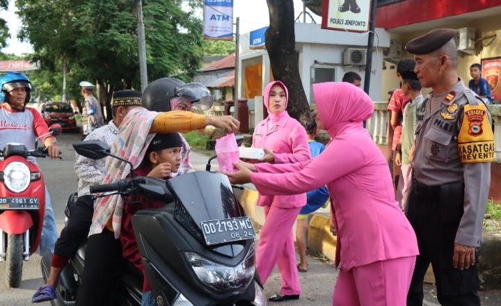 SangrajawaliNews.Com, Jeneponto – Ketua Bhayangkari Cabang Jeneponto Ny. Rini Budi Hidayat di dampingi Pengurus Bhayangkari membagikan takjil kepada pengendara yang melintas di depan Polres Jeneponto, 19 Maret 2024.
