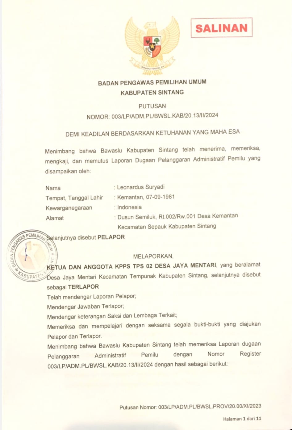 Kasus pelanggaran pemilu yang dilaporkan masyarakat kepada Bawaslu Kabupaten Sintang sdr P Alianto ke Bawaslu nomor laporan 011/LP/PL/Kab/20.13/11/2024 pada tanggal 26 Febuari 2024 masih membuat tanda tanya sebab dari hasil laporan dan dalam keputusan sidang perkara Bawaslu masih dianggap masyarakat tidak jelas dan transparan sebab beberapa laporan tidak di tanggapi dan tidak di jelaskan secara pakta dan data ungkap salah satu masyarakat yang mewakili dan engan menyebutkan namanya kepada awak media 20 Maret 2024 Wib di kediaman nya di Kcamatan Sepauk Kabupaten Sintang.
