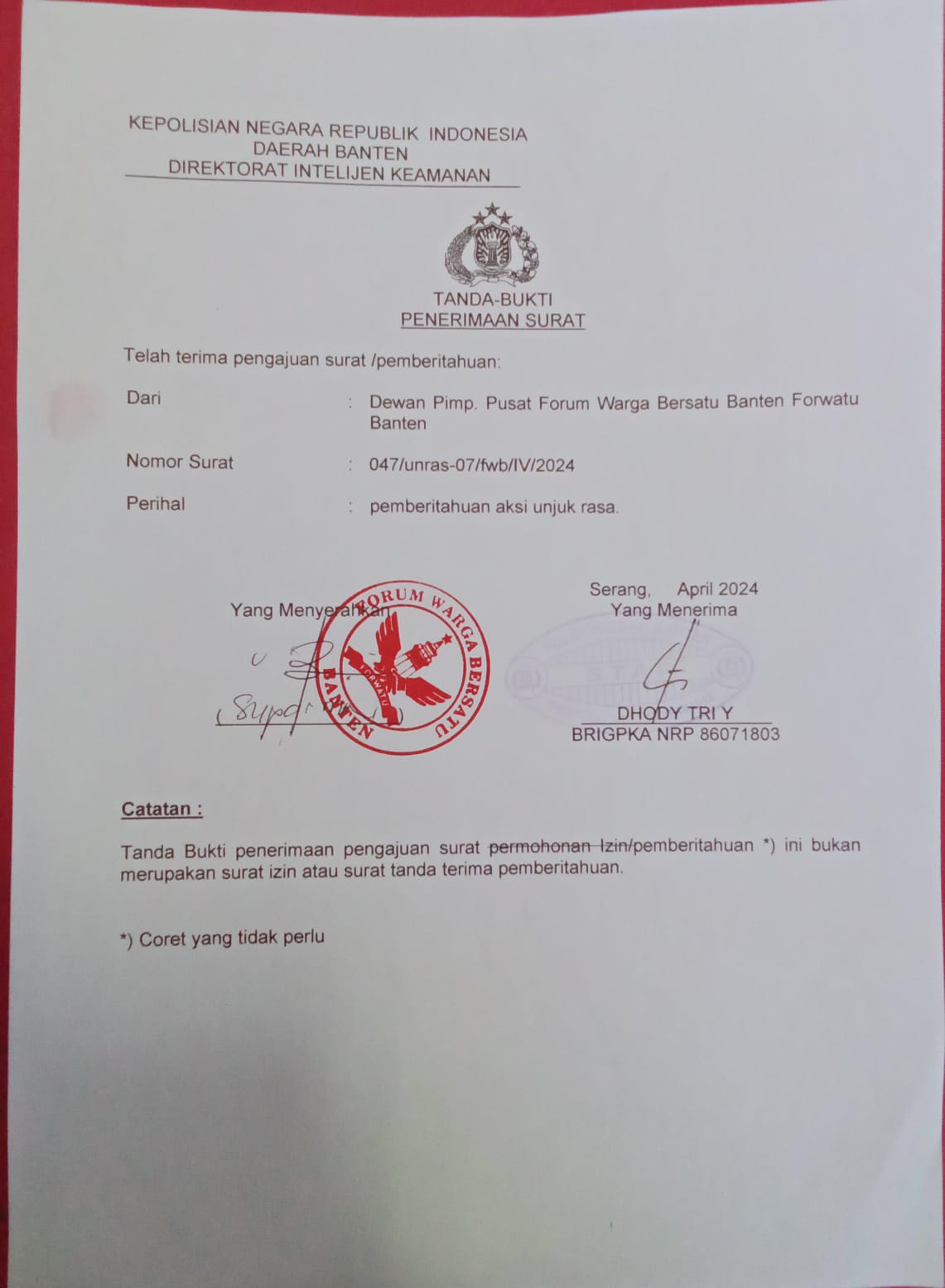 047/Unras-07/FWB/IV/2024. Yang di layangkan ke Polda Banten, berisikan tentang pemberitahuan aksi demontrasi yang akan dilaksanakan Forwatu pada Jumat, 5 April 2024 dengan estimasi massa sebanyak 300 orang di depan Kantor Kejati Banten dengan tuntutan sebagai berikut