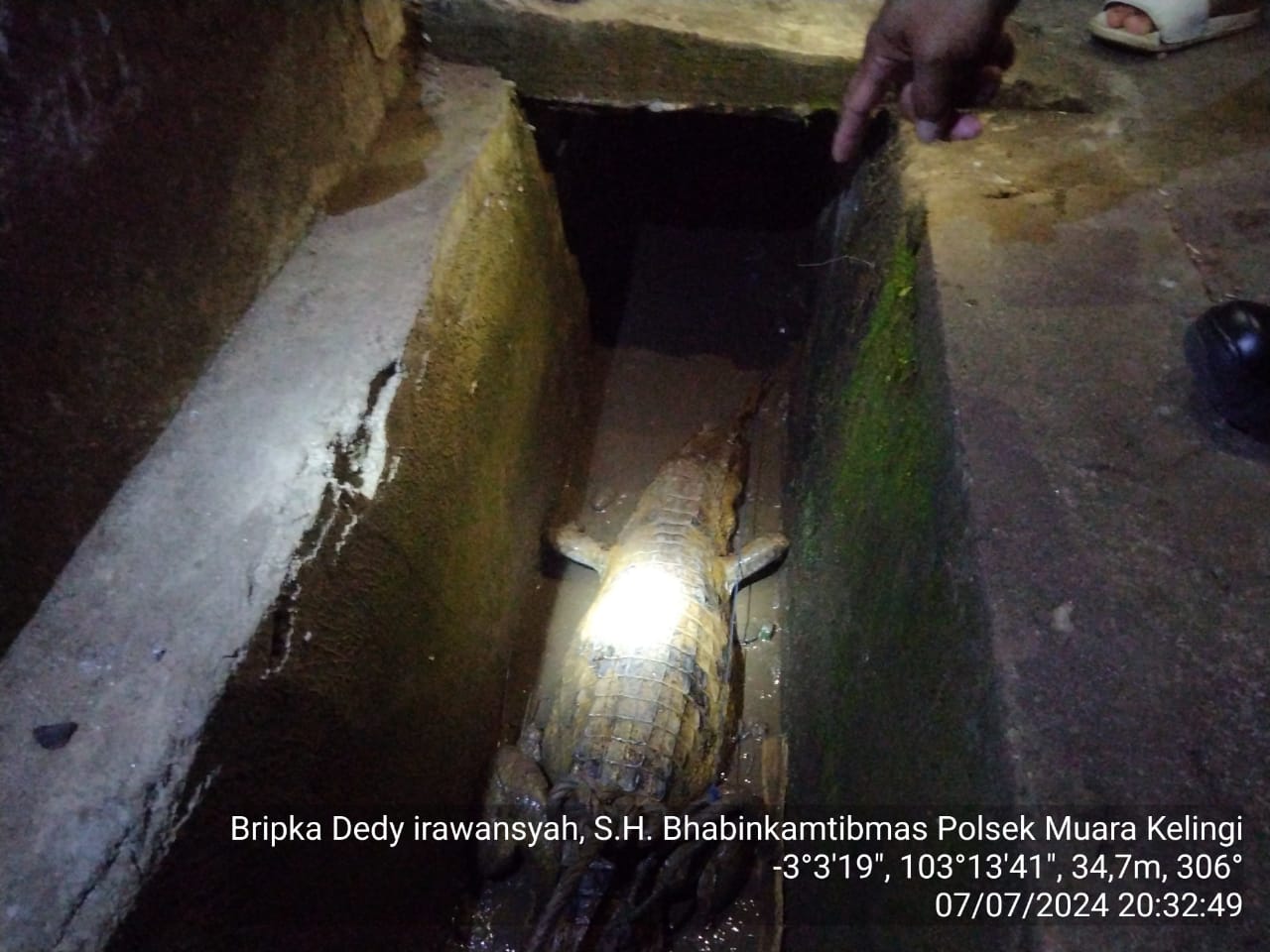 Setiba di lokasi, personel Polsek Muara Kelingi Polres Mura, langsung melakukan evakuasi buaya bersama warga, sekaligus mengamankan buaya tersebut.