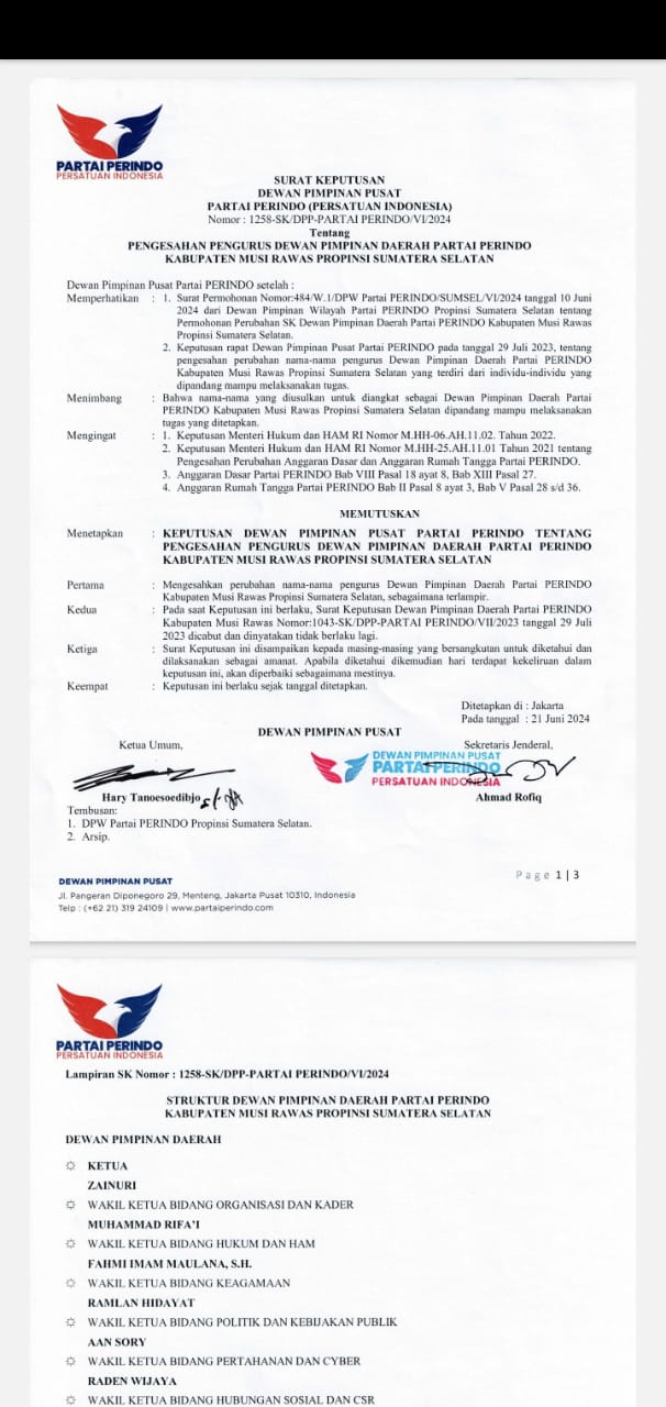 Surat Keputusan (SK) Kepengurusan Partai PERINDO Kabupaten Musi di ditetapkan DPP PERINDO pada tanggal 21 Juli 2024 di Jakarta. Ditanda tangani oleh Hery Tanoesoedipjo selaku ketua umum dan Ahmad Ropiq selaku sekretaris Jendral DPP partai PERINDO.