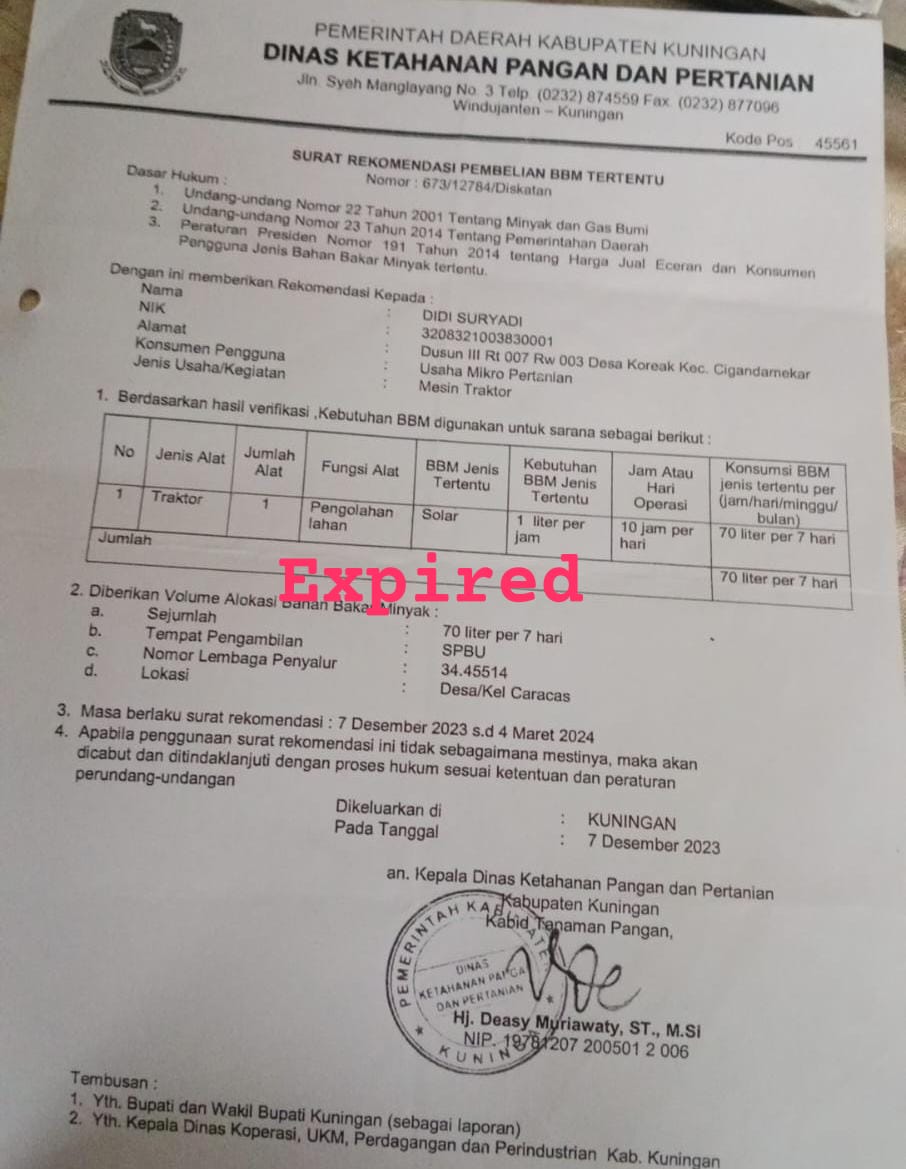 Namun saat di tanyakan nama terduga pelaku mafia BBM bersubsidi atas nama orang koreak ini terlampir satu berkas kertas dari Dinas Pertanian sudah expired artinya, sudah tidak berlaku dan harus di perpanjang.