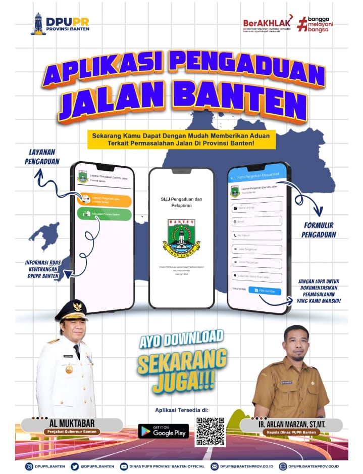 Sebagai informasi, bagi masyarakat yang akan melakukan pengaduan permasalahan jalan dan jembatan yang menjadi kewenangan Provinsi Banten melalui aplikasi Pengaduan Jalan Banten dapat langsung mengunduh aplikasinya melalui link : https://play.google.com/store/apps/details?id=com.sijjmasyarakat.sijj