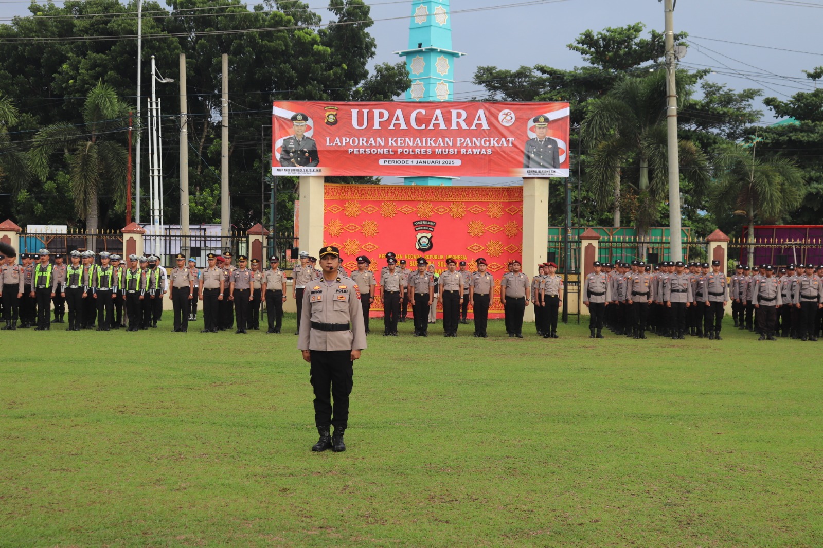 Dalam sambutannya dan arahannya, kapolres mengatakan, kita mesti merasa bangga dan bersyukur pada hari ini personel Polres Musi Rawas, terhitung mulai tanggal 1 Januari 2025, mendapatkan kenaikan pangkat dengan jumlah total sebanyak 44 personel yang terdiri dari 11 perwira dan 33 bintara.