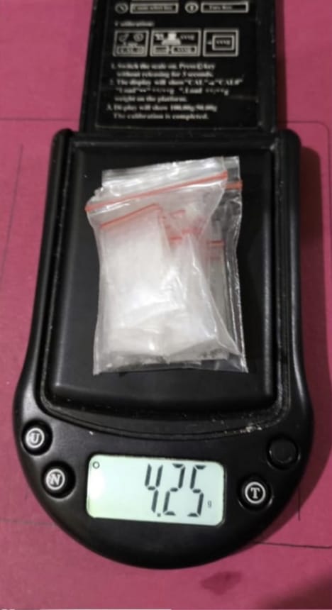 Saat dilakukan pengeledahaan, ditemukan BB tidak jauh dari tersangka diantaranya, satu bungkus rokok jenis filter yang di dalamnya berisikan 25 bungkus plastik klip bening berukuran kecil yang berisikan kristal putih yang diduga narkotika jenis sabu seberat bruto 4,25 gram dan tersangka mengakui seluruh barang bukti tersebut adalah miliknya. Terang Kasat.