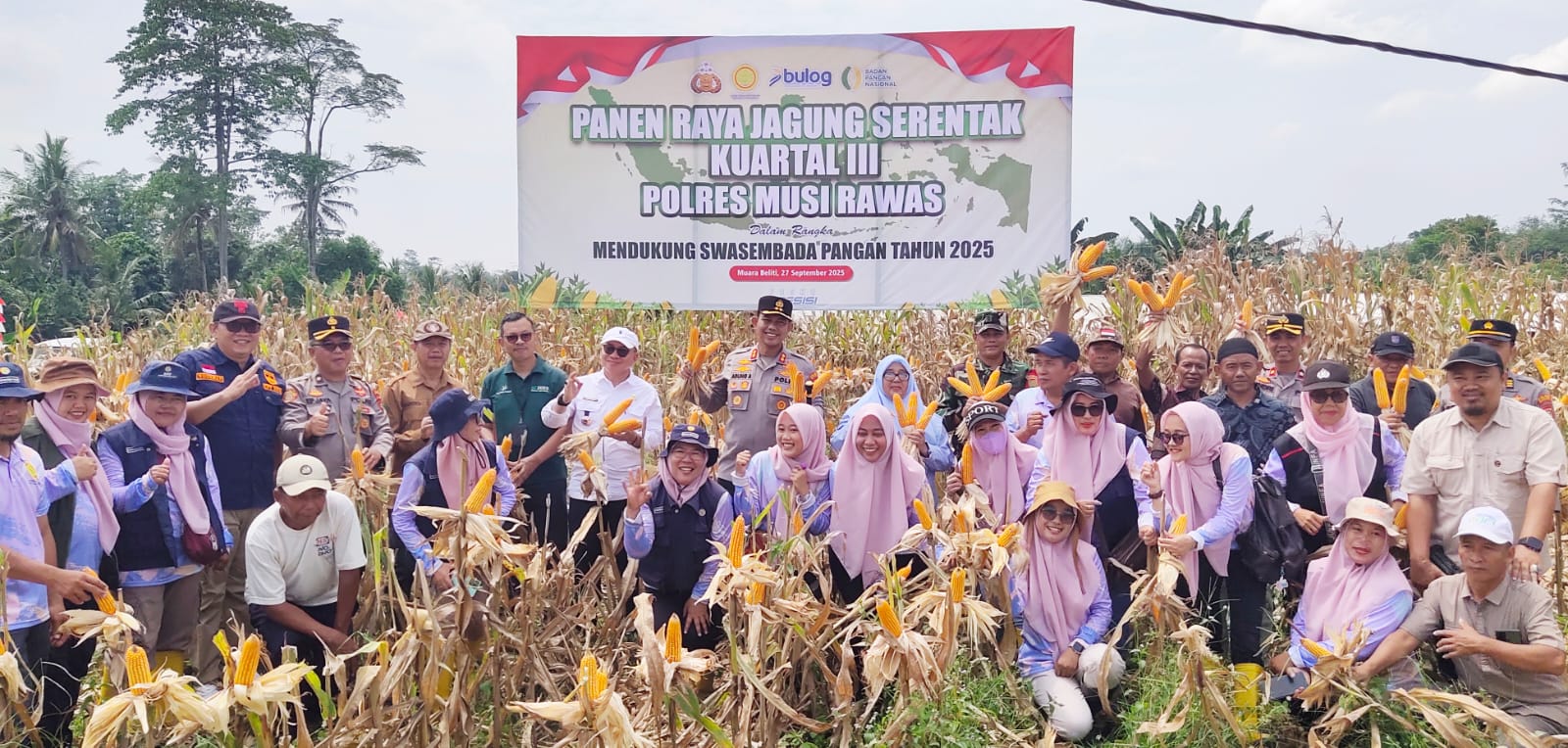 SangrajawaliNews.My.Id | Musi Rawas – Kapolres Musi Rawas (Mura), AKBP Agung Adhitya Prananta SH, SIK, MH, didampingi, Wakapolres, Kompol Hendri SH, melakukan Panen Raya Jagung Serentak Kuartal III Polres Mura, Dalam Rangka Mendukung Swasembada Pangan Tahun 2025, di Dusun 7, Desa Suro, Kecamatan Muara Beliti, Kabupaten Mura, Sabtu (27/9/2025).