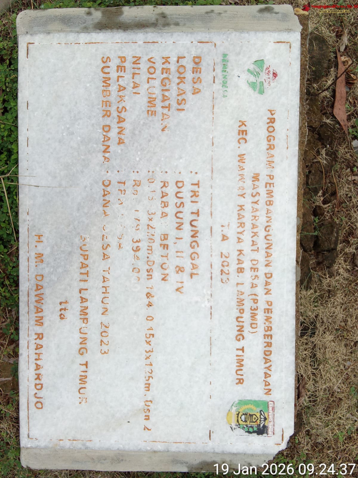Selanjutnya kami dari warga desa Tritunggal wawaykarya berharap kepada kepada bapak camat wawaykarya dan kasi PMD kecamatan minta di tegur kepala desa Tritunggal dan bangunan tersebut minta segera ada per perbaikan itu yang di harapkan warga kami sangat kecewa dengan ada nya proyek desa di laksanakan ke Giatan oleh TPK dan kepala desa selaku pengelola anggran dana desa tersebut.